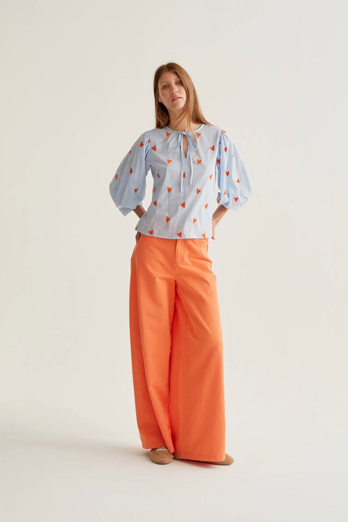 Con bordado de corazones de color naranja.
