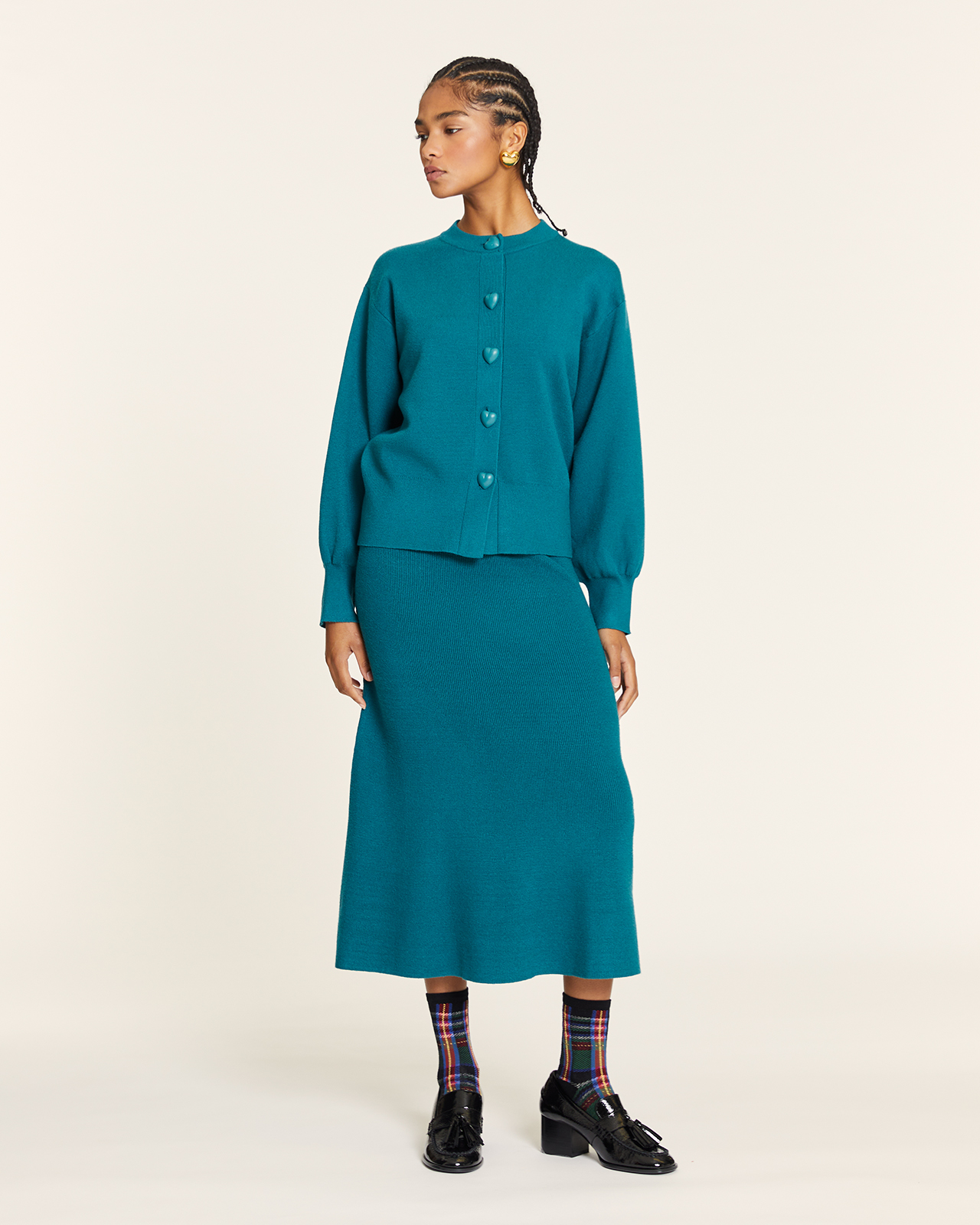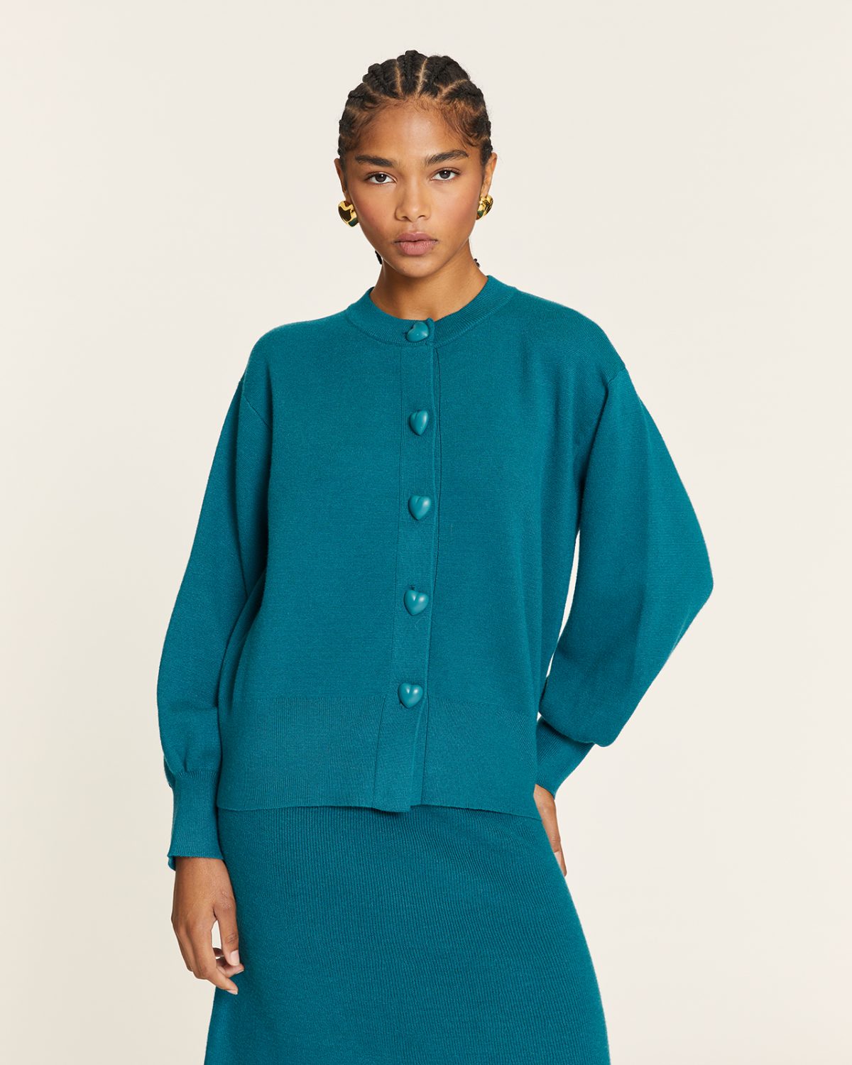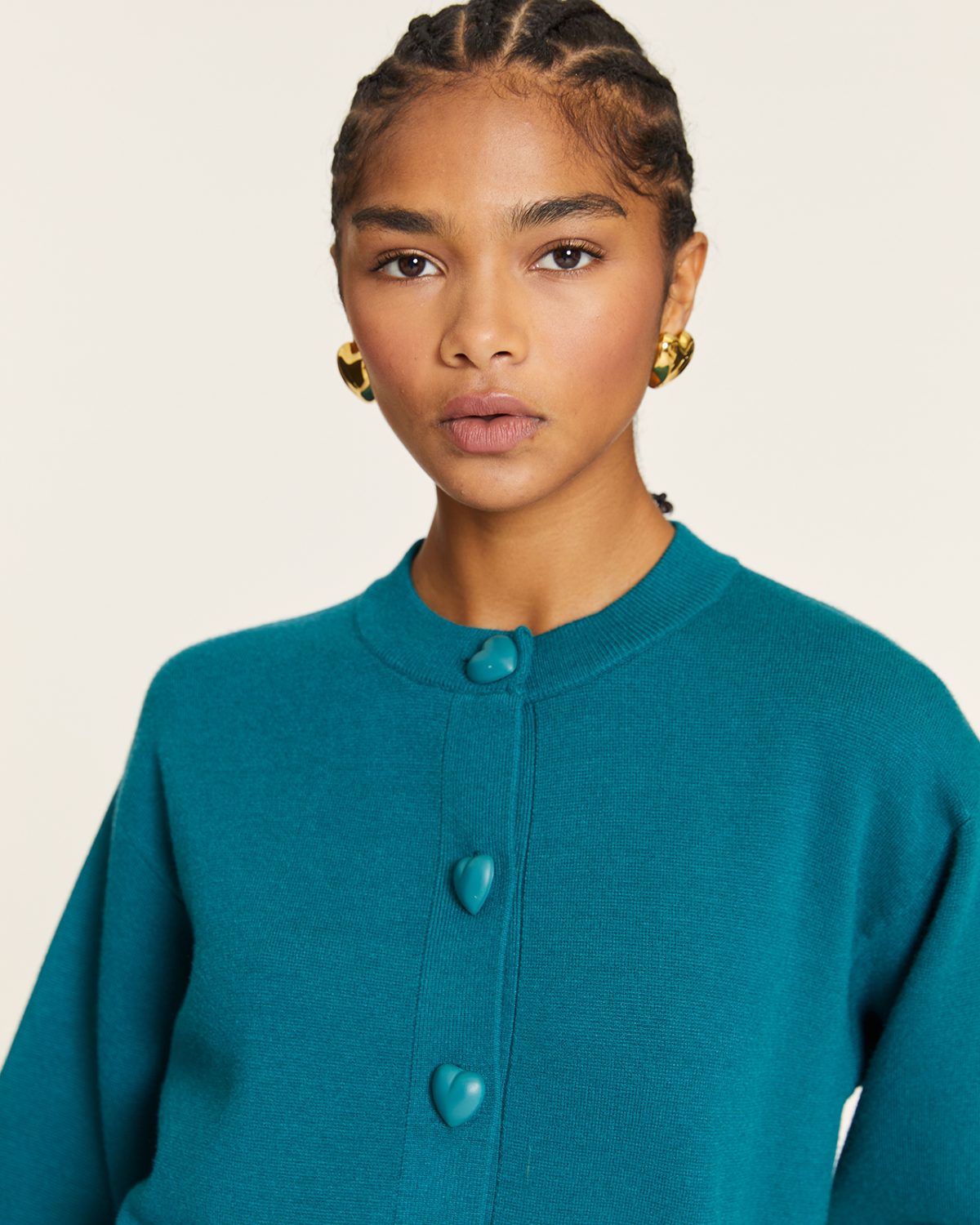 Cierre frontal con botones en forma de corazón.