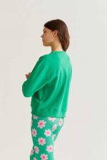 Color verde con bordado de flor rosa en la parte delantera.